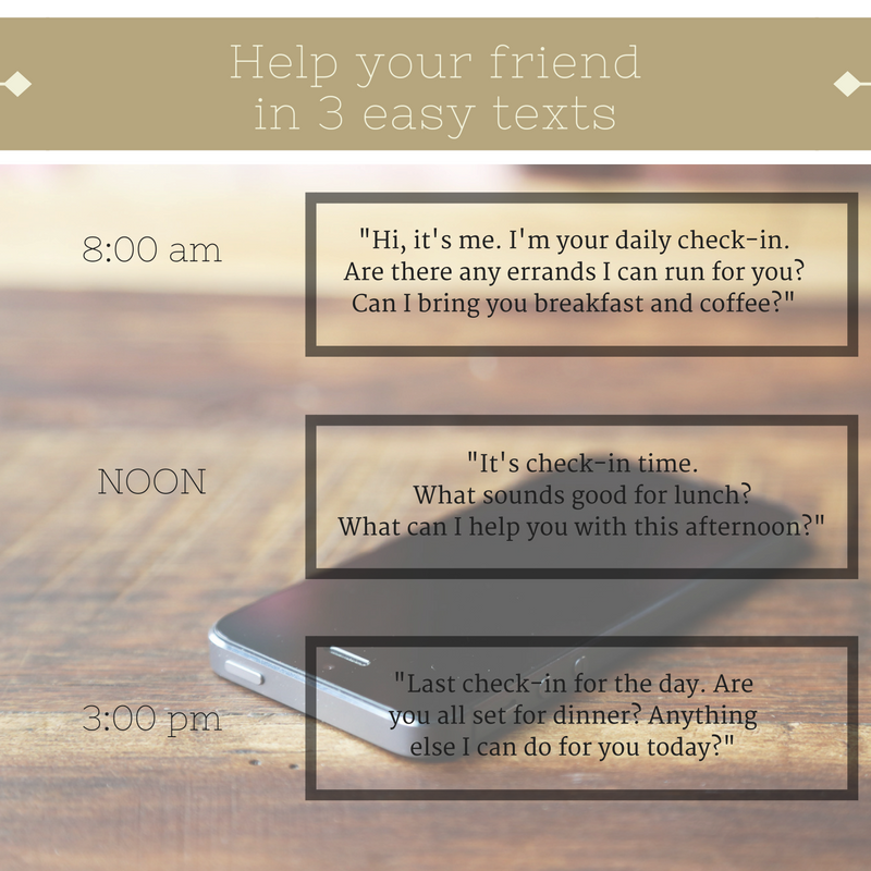 Your friend may not need anything at all but knowing someone is there who will be checking in can bring great comfort. Remember to add reminders to your phone so you don't forget to check-in!